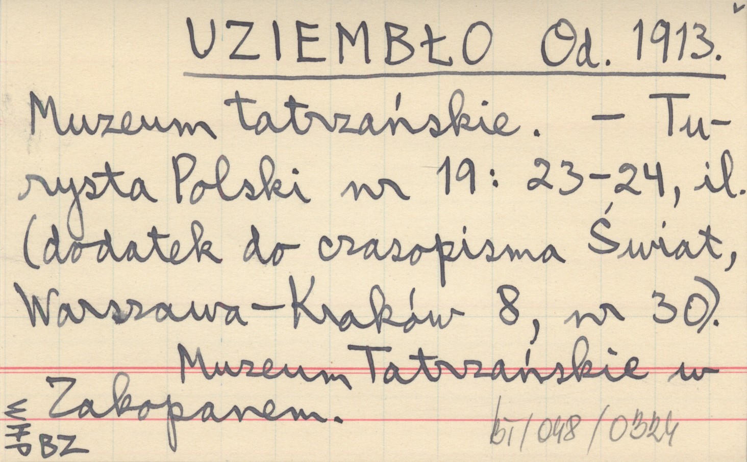 Świat, dod. Turysta Polski (Warszawa ; Kraków ;) , 8, nr 30 ; nr 19: 23-24, il. Muzeum Tatrzańskie w Zakopanem.