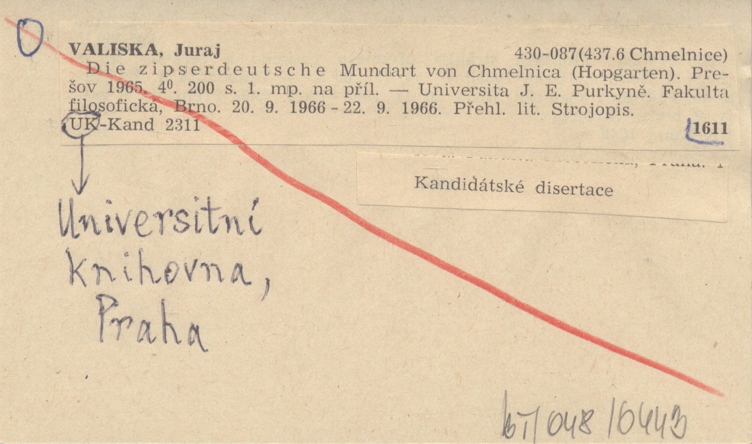 Prešov , 4°, 200 s., 1 m. na přil. Universita J. E. Purkyně. Fakulta filosofická, Brno. 20-22 IX 1966. Přehl. lit. Strojopis. Universitní knihovna, Praha - Kand 231. Kandidátské disertace