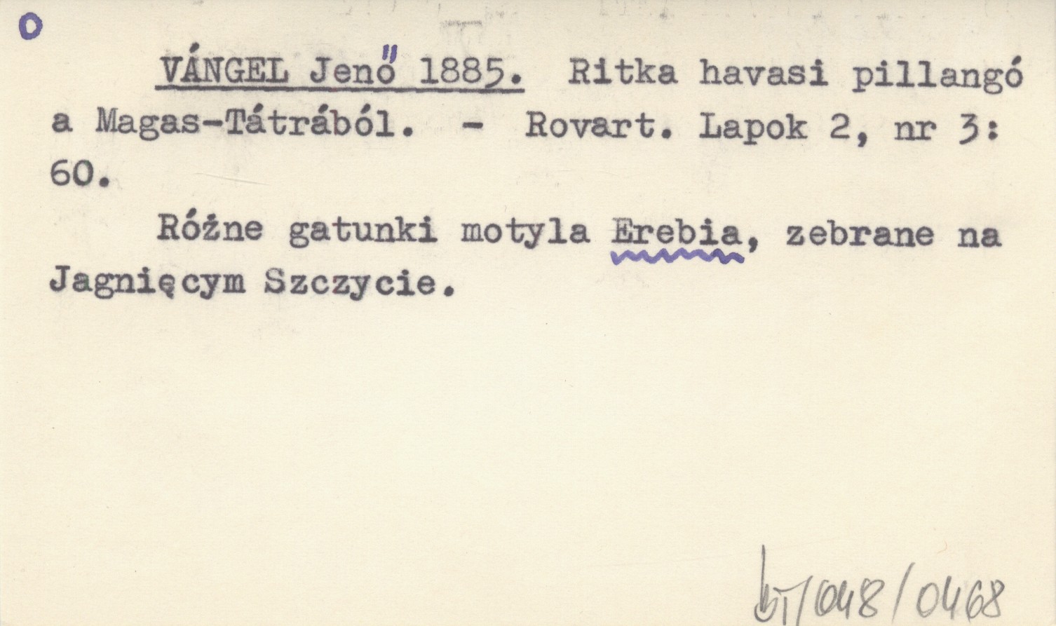 VÁNGEL Jenő 1885 Ritka havasi pillangó a Magas-Tátrából.