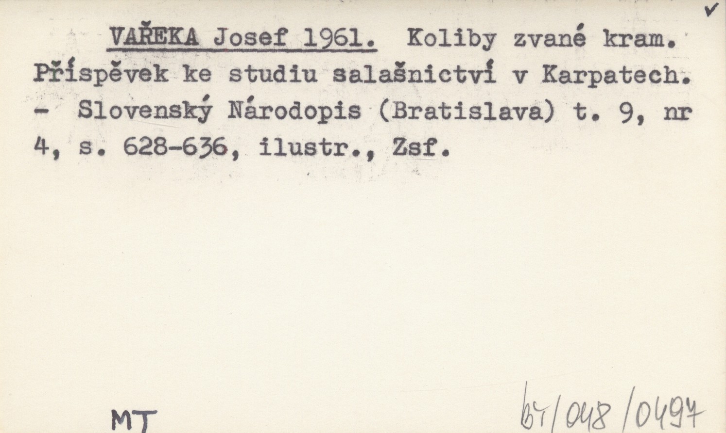 VAŘEKA Josef 1961 Koliby zvané kram. Příspěvek ke studiu salašnictví v Karpatech.