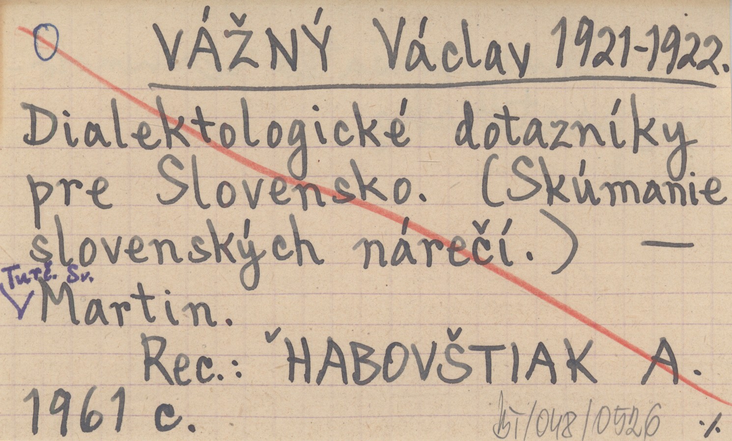 VÁŽNÝ Václav 1921-1922 Dialektologické dotazníky pre Slovensko. (Skúmanie slovenských nárečí).