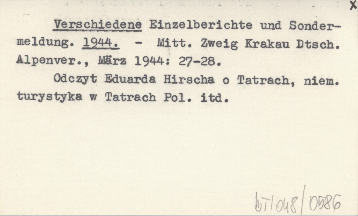 Mitt. Zweig Krakau Dtsch. Alpenver., III 1944: 27-28. Odczyt Eduarda Hirscha o Tatrach, niem. turystyka w Tatrach Pol. itd.