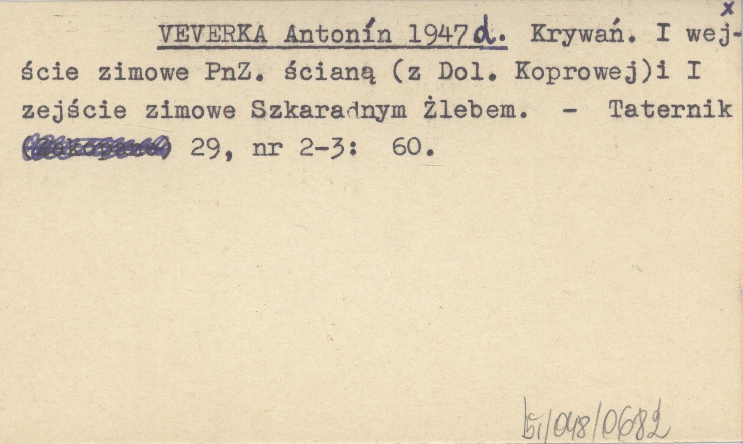 VEVERKA Antonín 1947 d Krywań. I wejście zimowe PnZ. ścianą (z Dol. Koprowej)i I zejście zimowe Szkaradnym Żlebem.