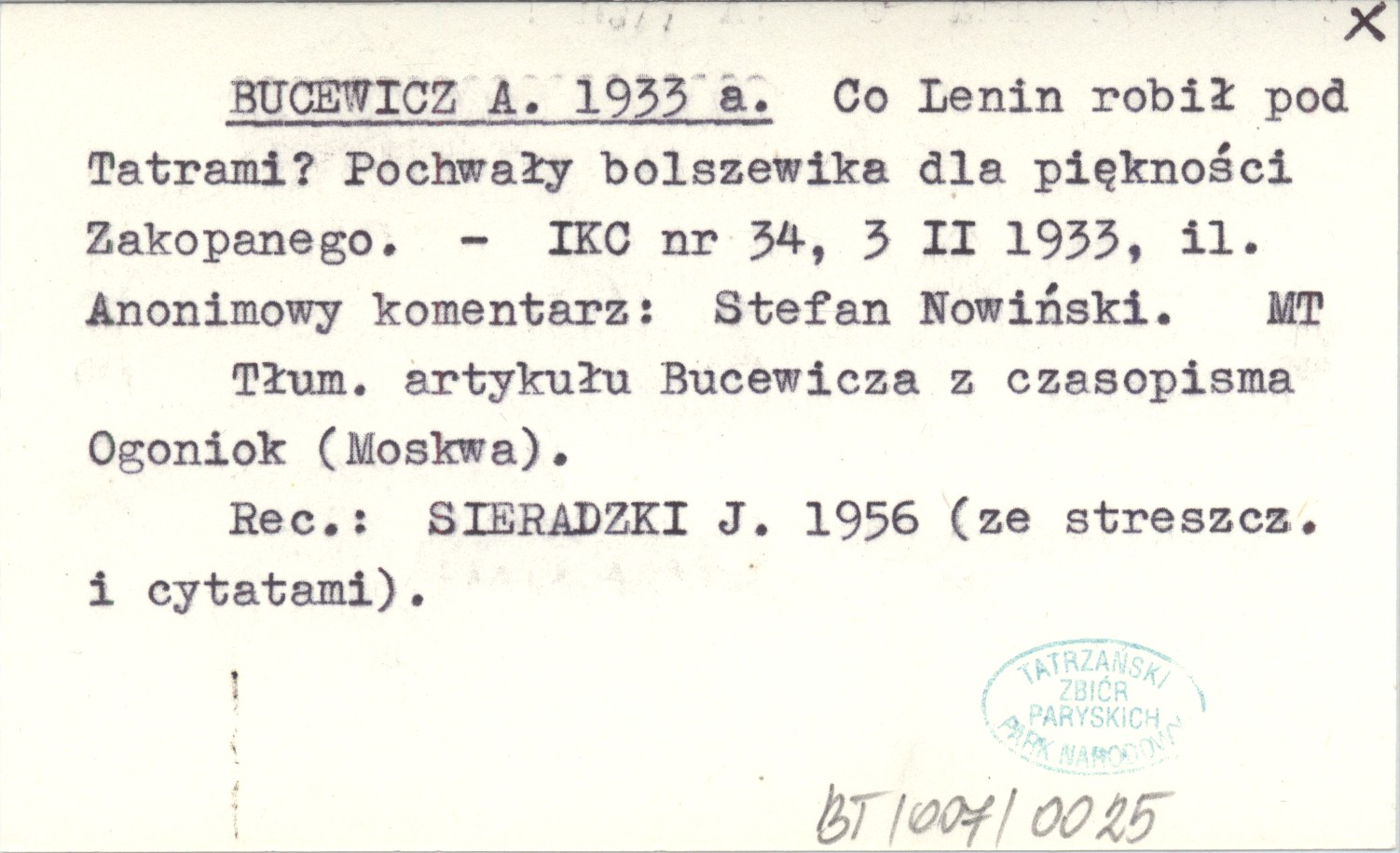 BUCEWICZ A. 1933 a Co Lenin robił pod Tatrami? Pochwały bolszewika dla piękności Zakopanego.