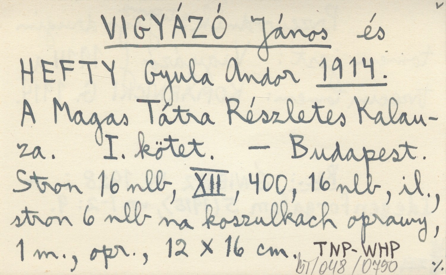 VIGYÁZÓ János HEFTY, Gyula Andor. ; 1914 A Magas Tátra Részletes Kalauza. I. kötet.