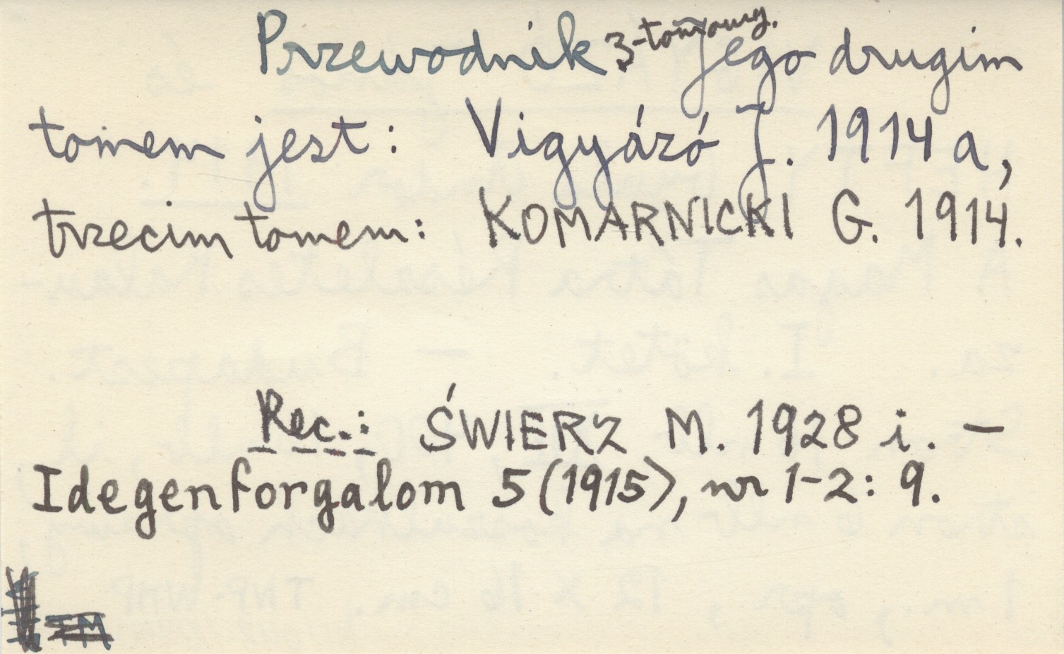 Budapest , [16] s., XII s., 400 s., [16] s., il., 1 m., opr., 12x16 cm. Przewodnik 3-tomowy. Jego drugim tomem jest: Vigyázó J. 1914 a, trzecim tomem: KOMARNICKI G. 1914. REC: ¦WIERZ M. 1928 i ; Idegenforgalom 5 (1915), nr 1-2: 9 ;