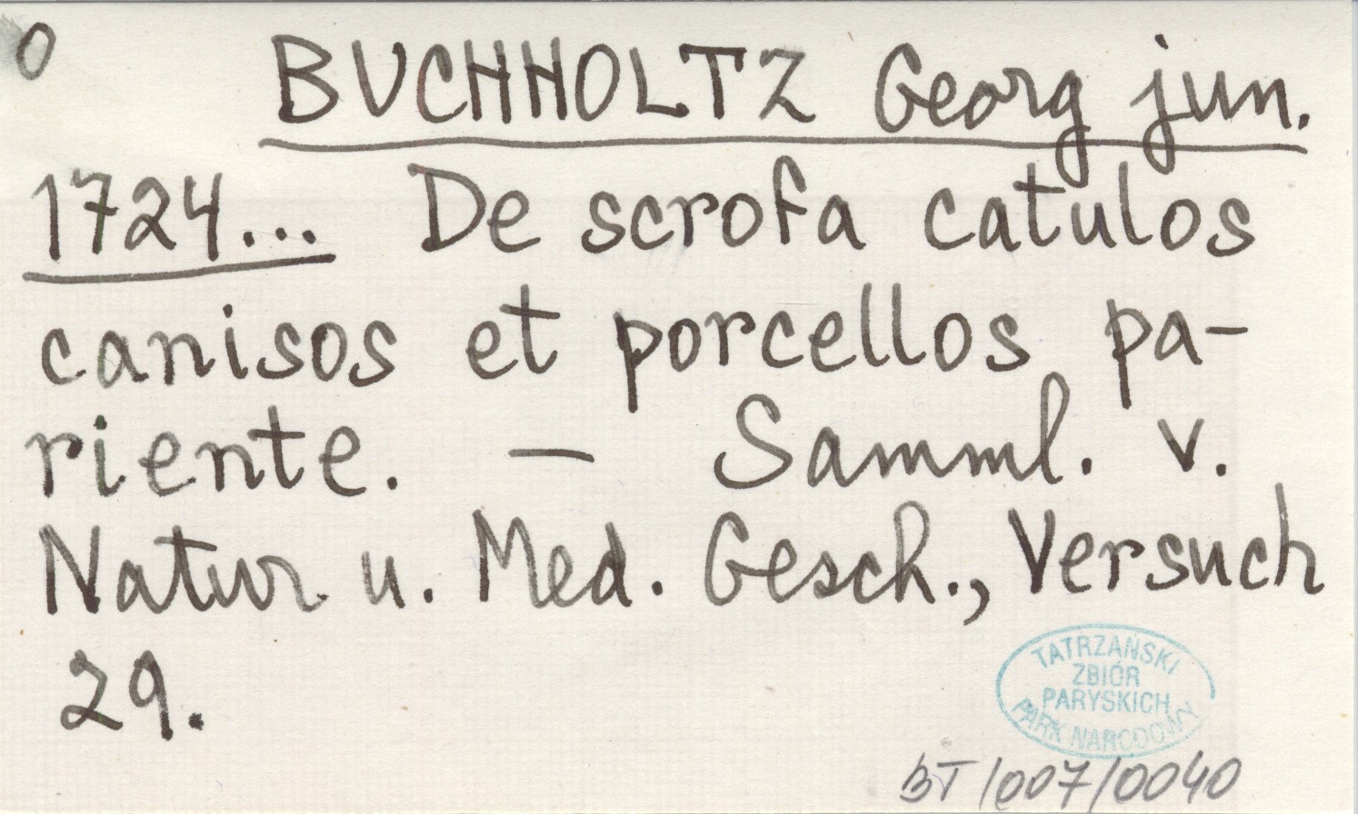 BUCHHOLTZ Georg jun. 1724... De scrofa catolus canisos et porcellos pariente.