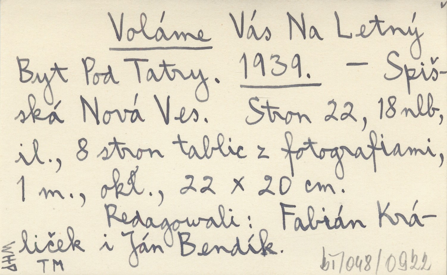 Spišská Nová Ves , 22 s., [18] s., il., 8 k. tabl. (fot.), 1 m., okł., 22x20 cm. Redagowali: Fabián Králiček i Ján Bendík.