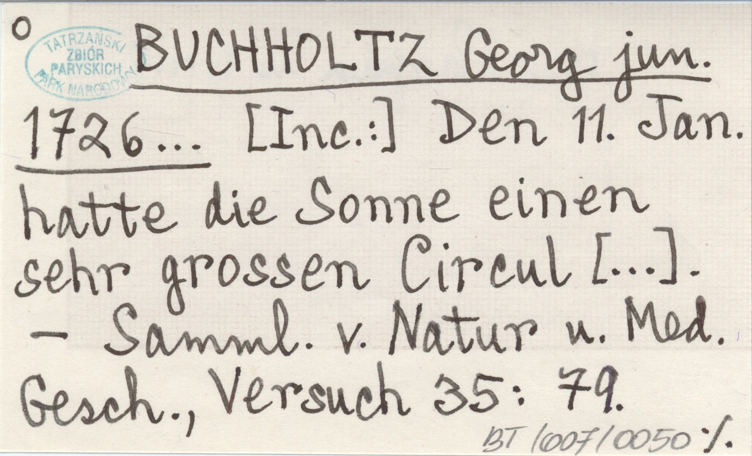 BUCHHOLTZ Georg jun. 1726... [Inc.:] Den 11. Jan. hatte die Sonne einen sehr grossen Circul [...].