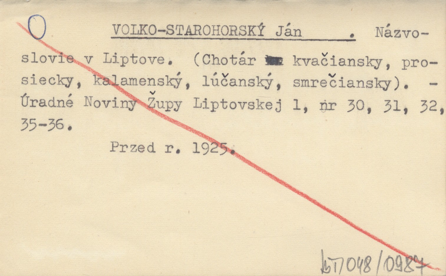 VOLKO-STAROHORSKÝ Ján przed 1925 Názvoslovie v Liptove. (Chotár kvačiansky, prosiecky, kalamenský, lúčanský, smrečiansky).