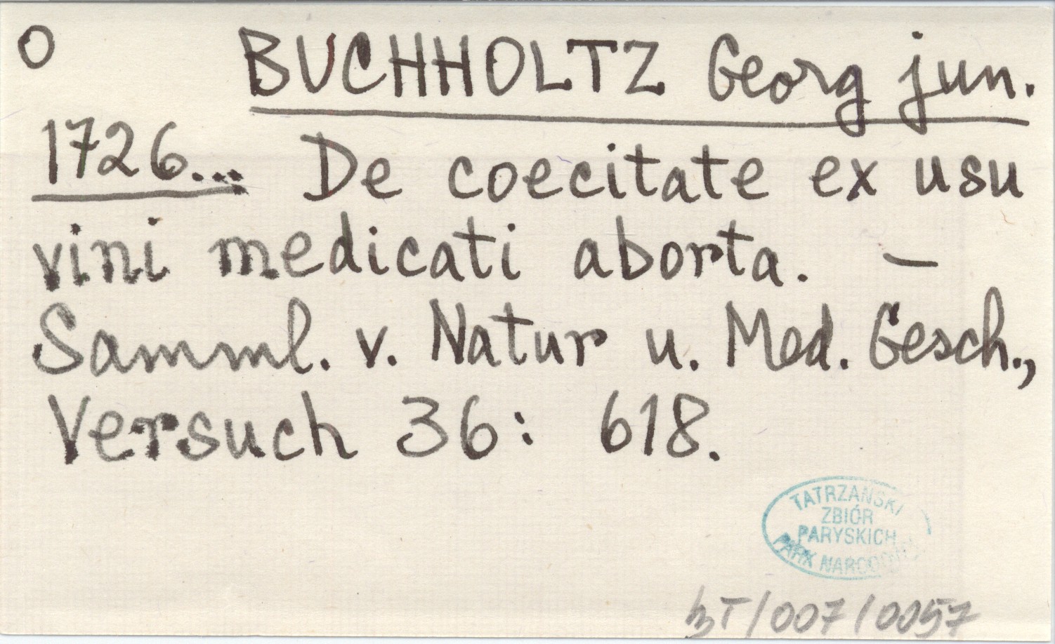 BUCHHOLTZ Georg jun. 1726... De coecitate ex usu vini medicati aborta.