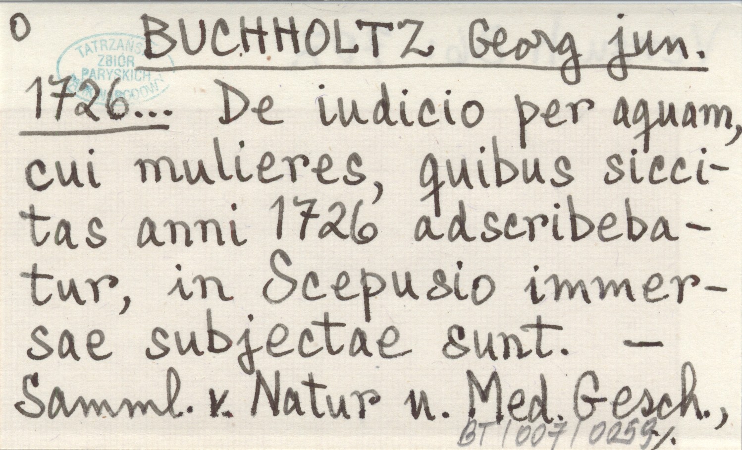 BUCHHOLTZ Georg jun. 1726... De iudicio per aquam ciu mulieres, quibus siecitas anni 1726 adseribebatur, in Scepusio immersae subjectae sunt.