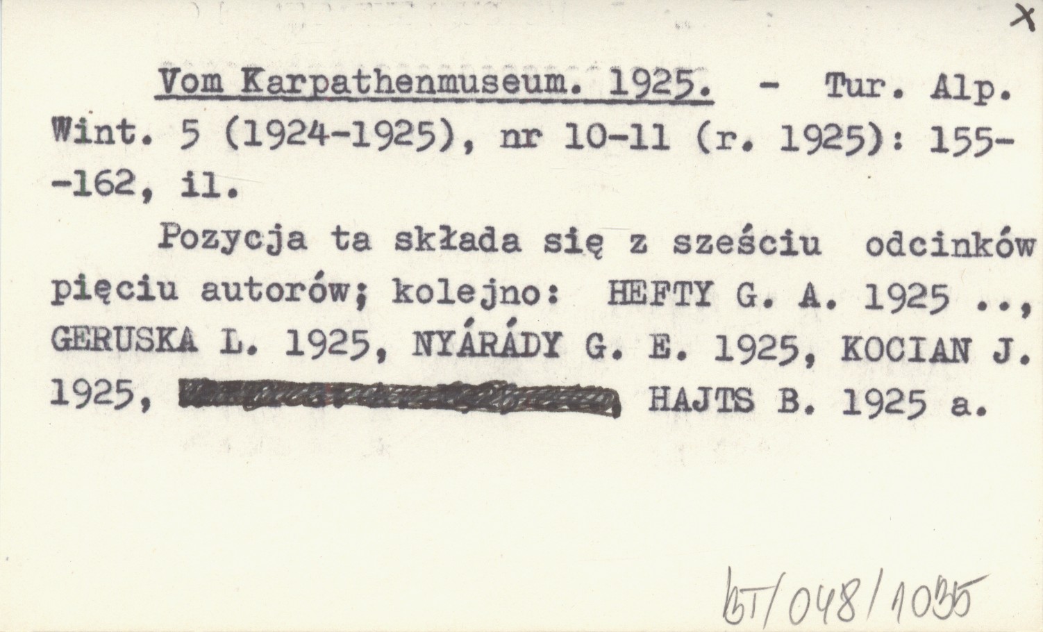 Turistik, Alpinismus, Wintersport, 5 (1924-1925), nr 10-11 (r. 1925): 155-162, il. Pozycja ta składa się z sześciu odcinków pięciu autorów; kolejno: HEFTY G. A. 1925..., GERUSKA L. 1925, NYÁRÁDY G. E. 1925, KOCIAN J. 1925, HAJTS B. 1925 a.