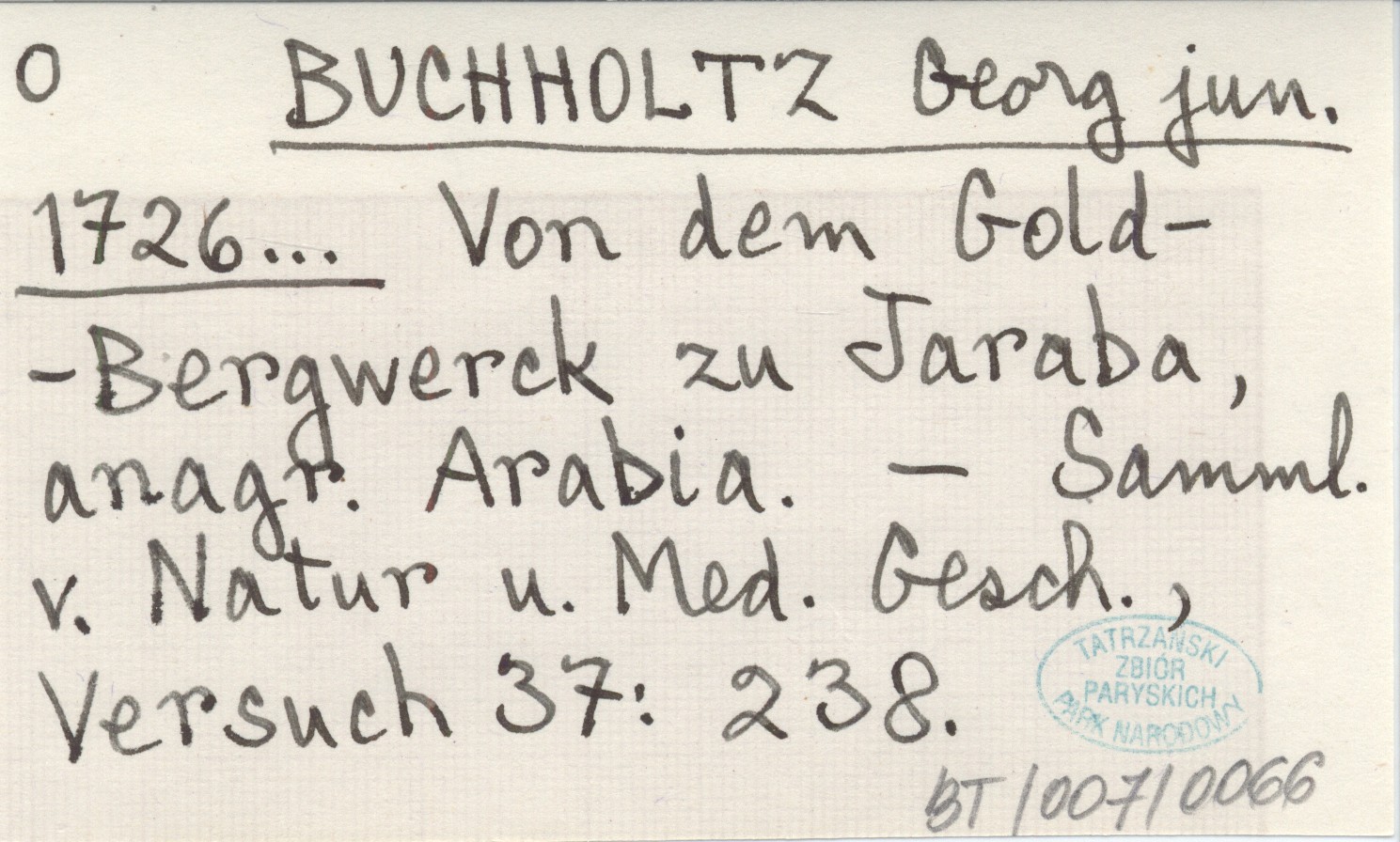 BUCHHOLTZ Georg jun. 1726... Von dem Gold-Bergwerck zu Jaraba, anagr. Arabia.