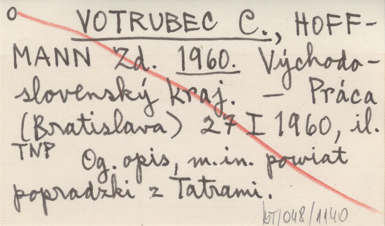 VOTRUBEC C. HOFFMANN, Zd. ; 1960 Východoslovenský kraj.