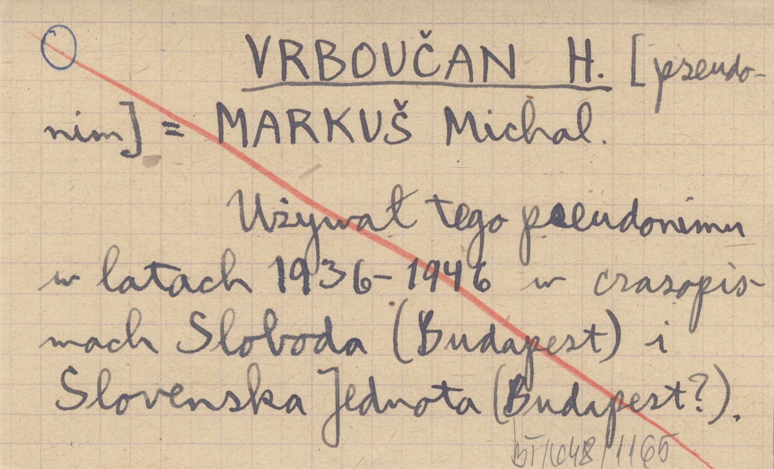 VRBOUČAN H. MARKUŠ Michal Używał tego pseudonimu w latach 1936-1946 w czasopismach Sloboda (Budapest) i Slovenska Jednota (Budapest?).