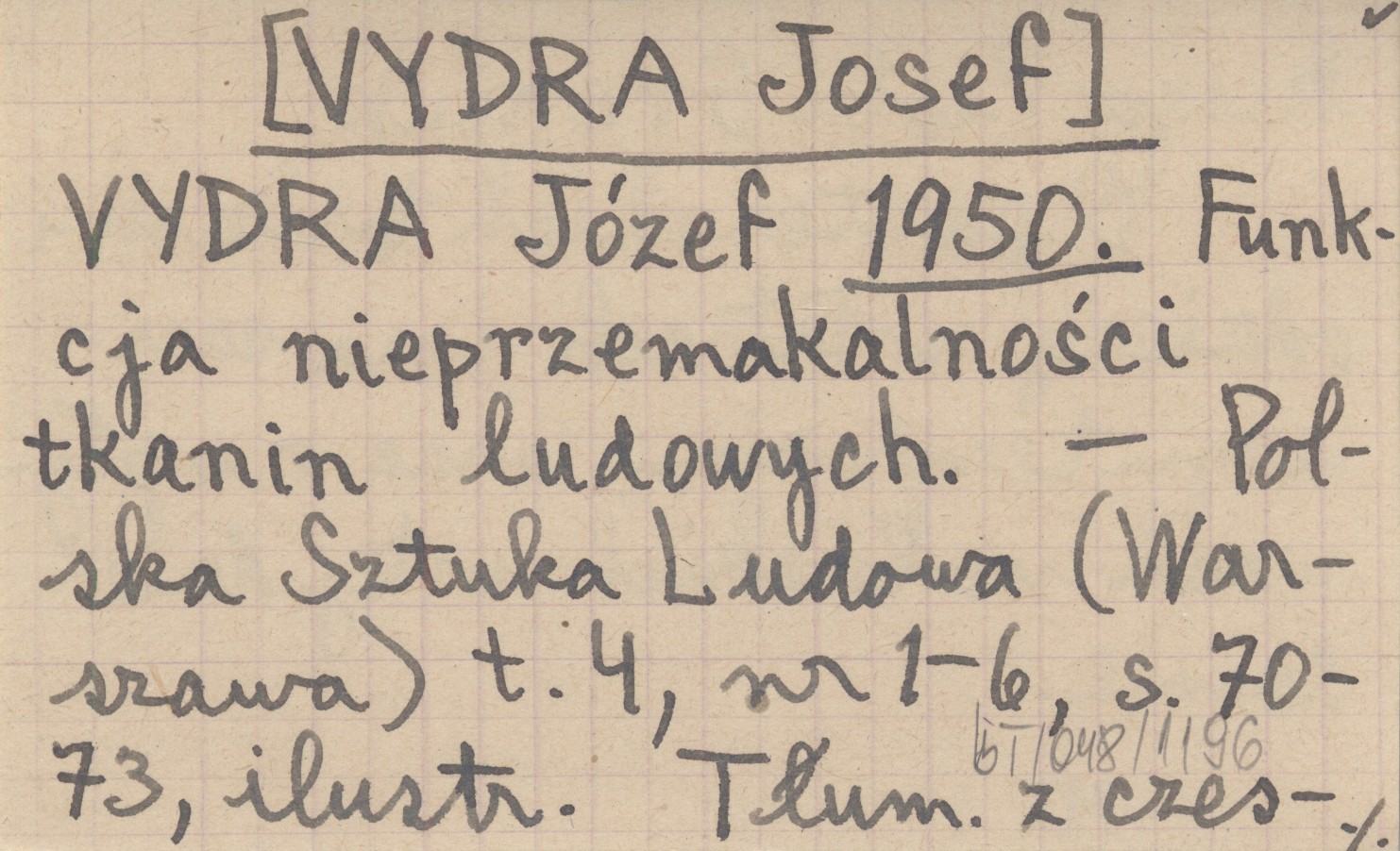 VYDRA Józef [VYDRA Josef] 1950 Funkcja nieprzemakalności tkanin ludowych.