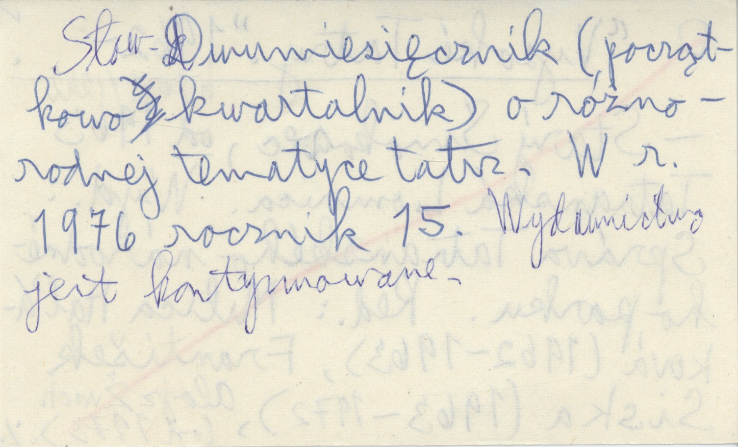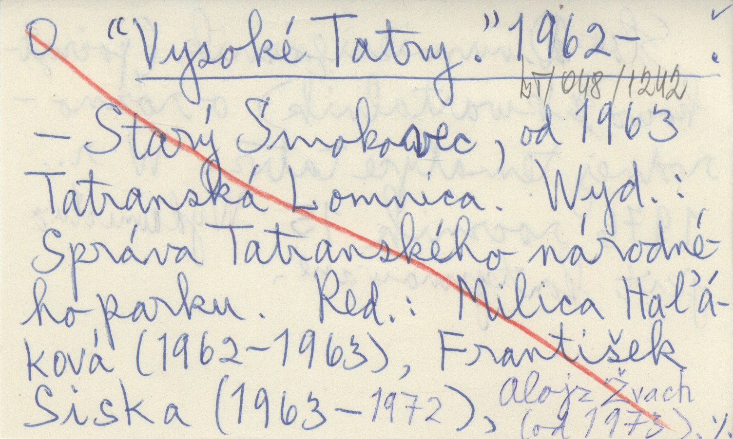 Správa Tatranského národného parku, Starý Smokovec ; Tatranská Lomnica (od 1963) ; Vysoké Tatry, 1962- . Słow. Dwumiesięcznik (początkowo kwartalnik) o różnorodnej tematyce tatrz. W r. 1976 rocznik 15. Wydawnictwo jest kontynuowane.