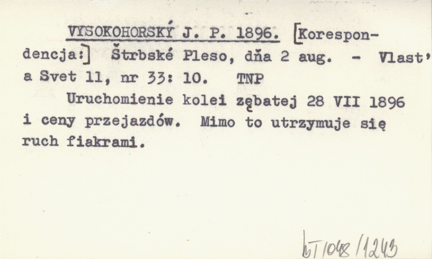 Vlasť a Svet, 11, nr 33: 10. [Korespondencja:] Uruchomienie kolei zębatej 28 VII 1896 i ceny przejazdów. Mimo to utrzymuje się ruch fiakrami.