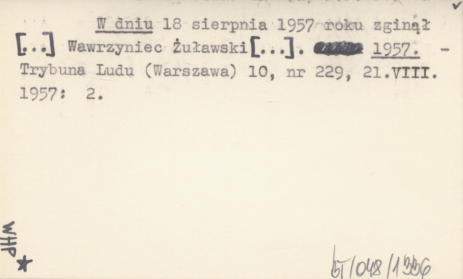 W dniu 18 sierpnia 1957 roku zginął [...] Wawrzyniec Żuławski [...]. 1957