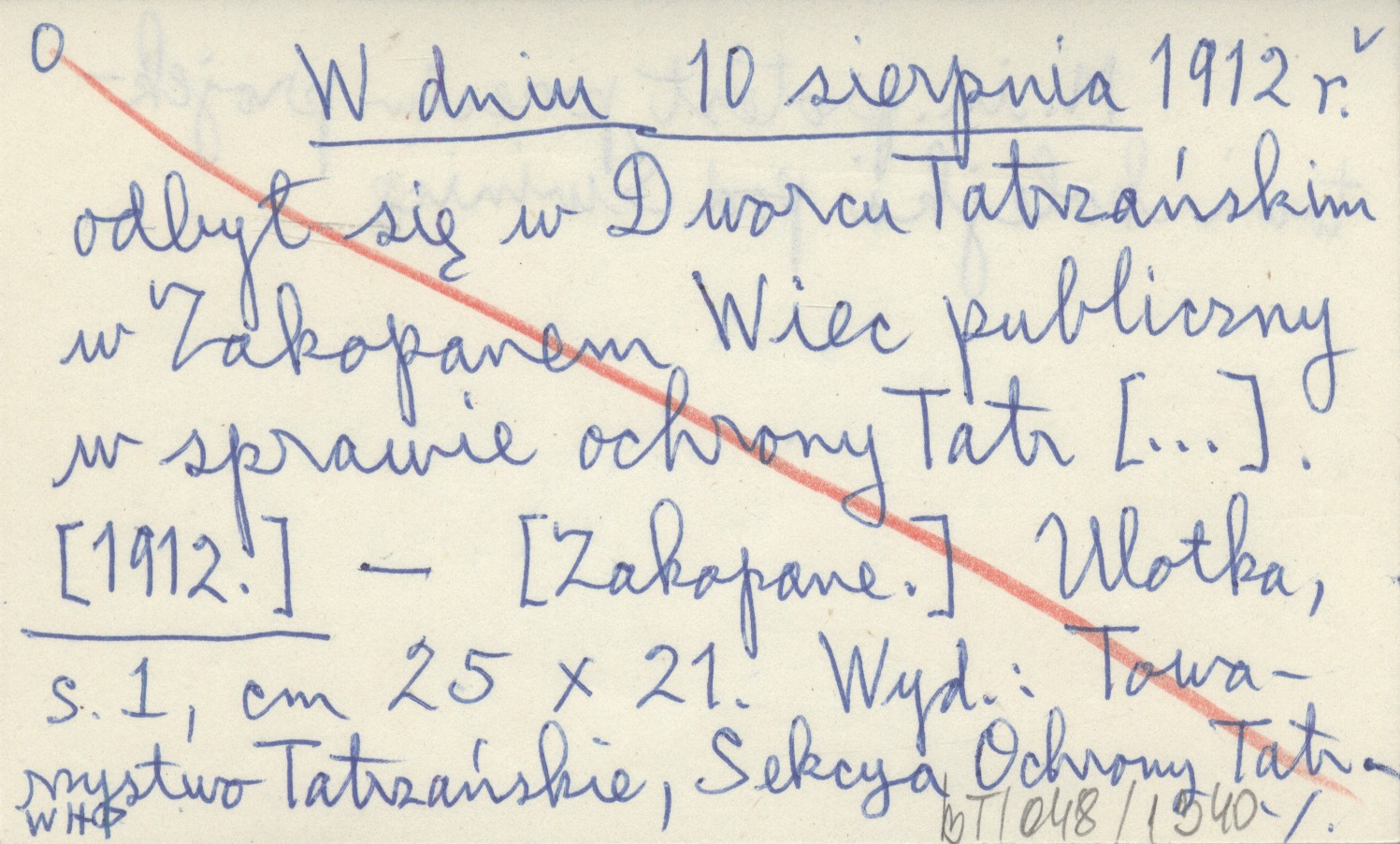 W dniu 10 sierpnia 1912 r. odbył się w Dworcu Tatrzańskim w Zakopanem Wiec publiczny w sprawie ochrony Tatr [...]. [1912]