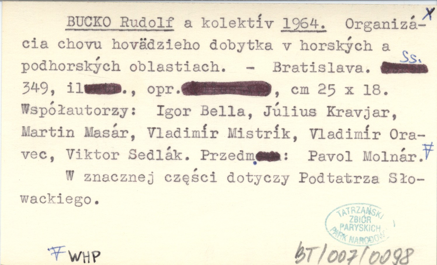 BUCKO Rudolf BELLA, Igor. ; KRAVJAR, Július. ; MASÁR, Martin. ; MISTRÍK, Vladimír. ; ORAVEC, Vladimír. ; SEDLÁK, Viktor. ; MOLNÁR, Pavol. ; 1964 Organizácia chovu hovädzieho dobytka v horských a podhorských oblastiach.