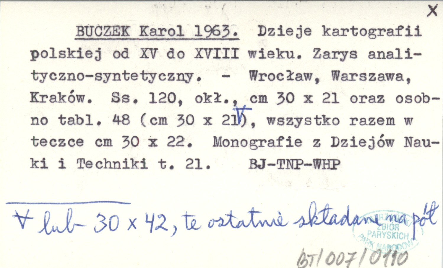 BUCZEK Karol 1963 Dzieje kartografii polskiej od XV do XVIII wieku. Zarys analityczno-syntetyczny.