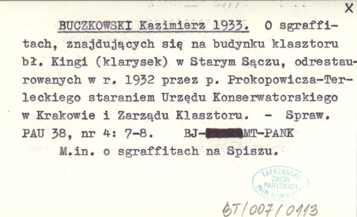 BUCZKOWSKI Kazimierz 1933 O sgraffitach, znajdujących się na budynku klasztoru bł. Kingi (klarysek) w Starym Sączu, odrestaurowanych w r. 1932 przez p. Prokopowicza-Terleckiego staraniem Urzędu Konserwatorskiego w Krakowie i Zarządu Klasztoru.
