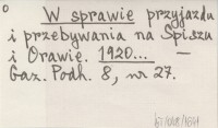 W sprawie przyjazdu i przebywania na Spiszu i Orawie. 1920...