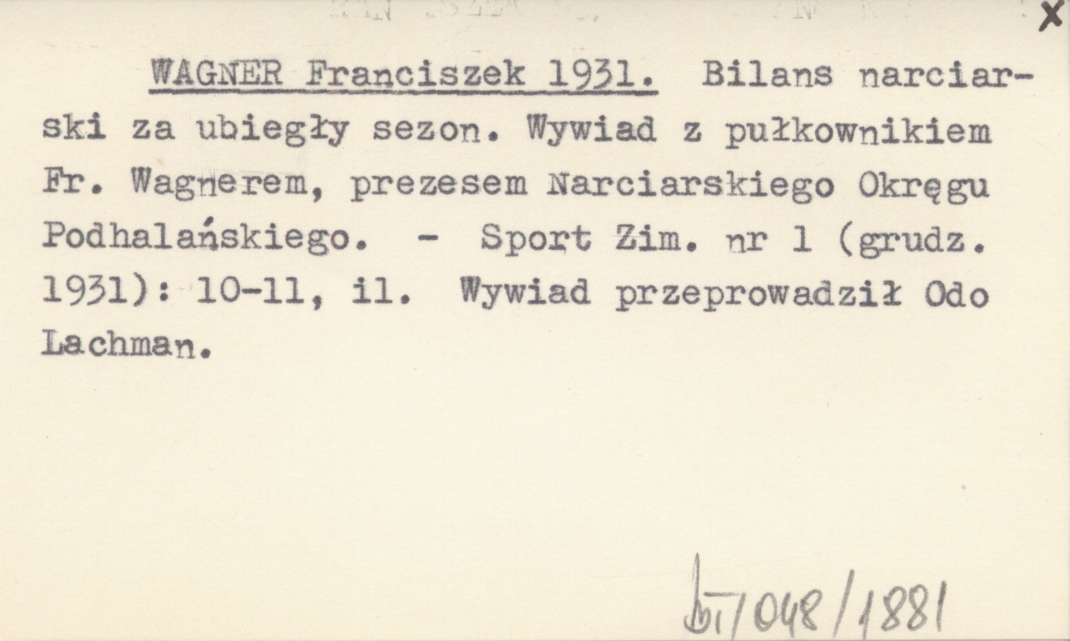 WAGNER Franciszek 1931 Bilans narciarski za ubiegły sezon. Wywiad z pułkownikiem Fr. Wagnerem, prezesem Narciarskiego Okręgu Podhalańskiego.