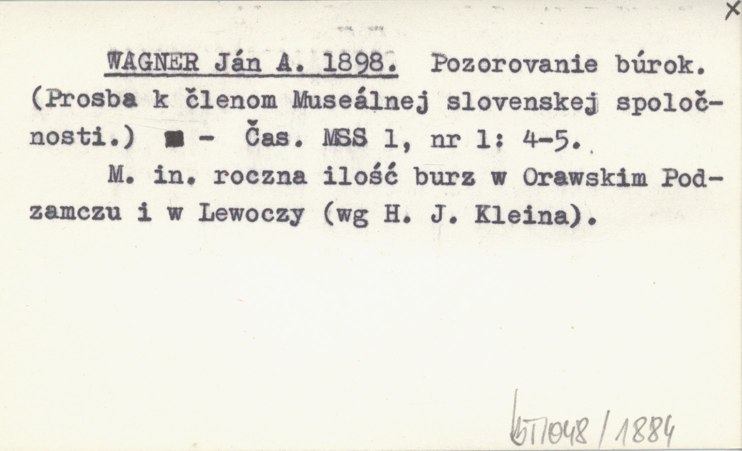 WAGNER Ján A. 1898 Pozorovanie búrok. (Prosba k členom Museálnej slovenskej spoločnosti).