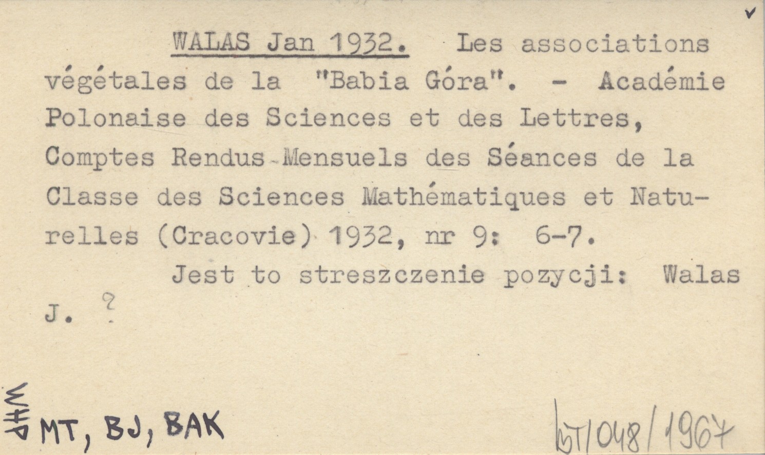 Académie Polonaise des Sciences et des Lettres, Comptes Rendus Mensuels des Séances de la Classe des Sciences Mathématiques et Naturelles (Cracovie) , Nr 9: 6-7. Jest to streszczenie pozycji: Walas J. ?