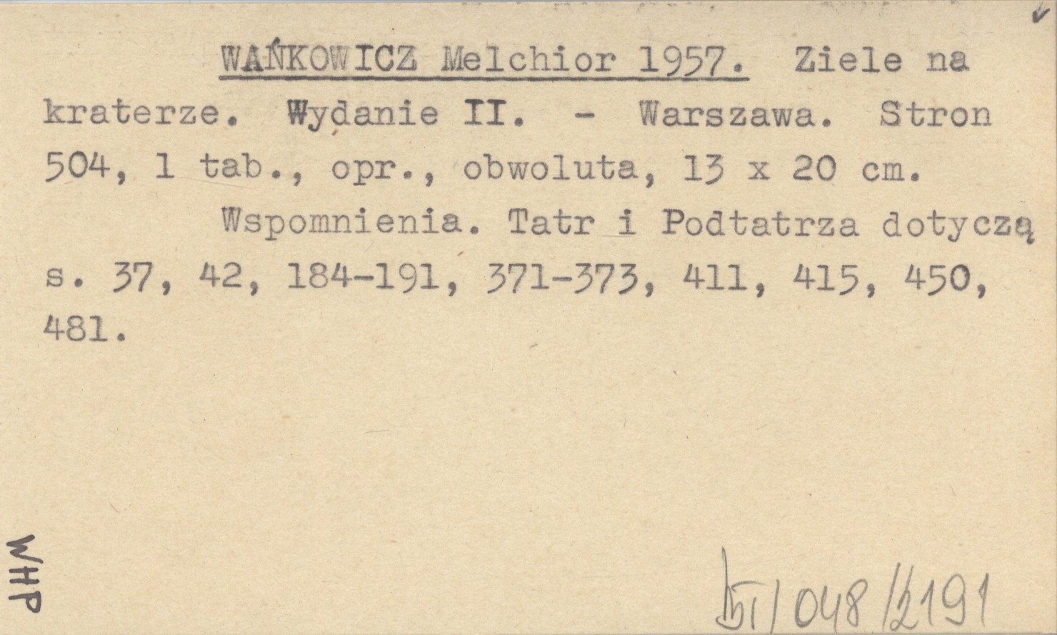 WYD: 2 Warszawa , 504 s., 1 k. tabl., opr., obw., 13x20 cm. Wspomnienia. Tatr i Podtatrza dotyczą s. 37, 42, 184-191, 371-373, 411, 415, 450, 481.