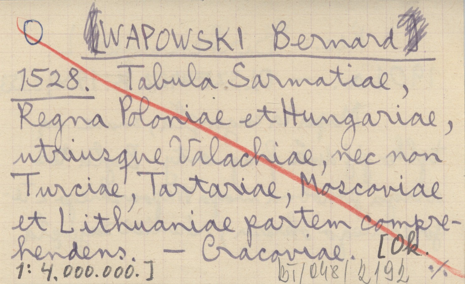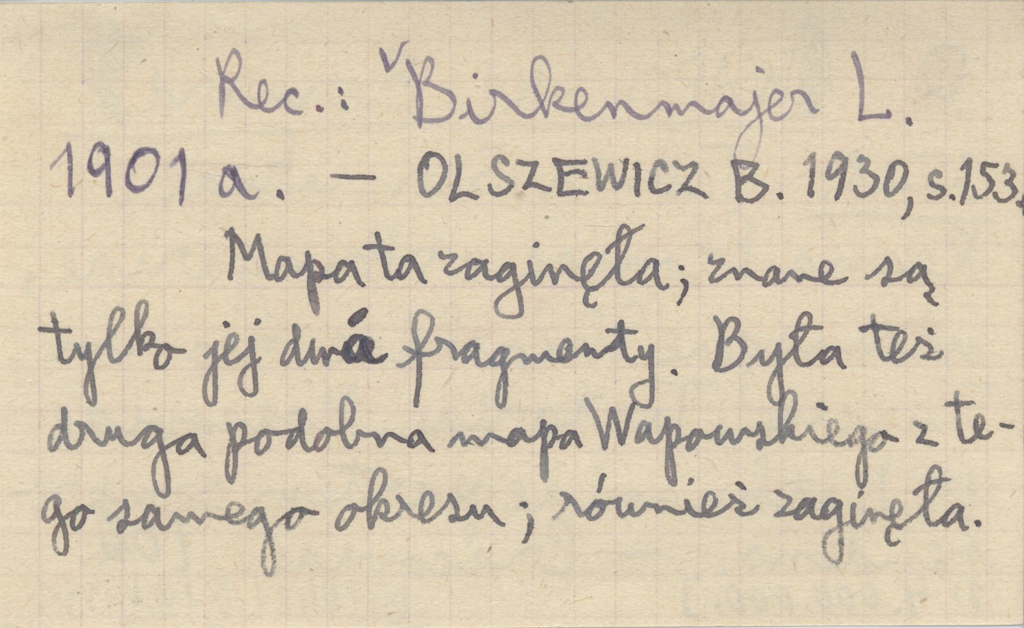 Cracoviae , Mapa ta zaginęła; znane są tylko jej dwá fragmenty. Była też druga podobna mapa Wapowskiego z tego samego okresu; również zaginęła. [Ok. 1: 4.000.000.] REC: BIRKENMAJER L. 1901 a ; OLSZEWICZ B. 1930, s. 153 ;