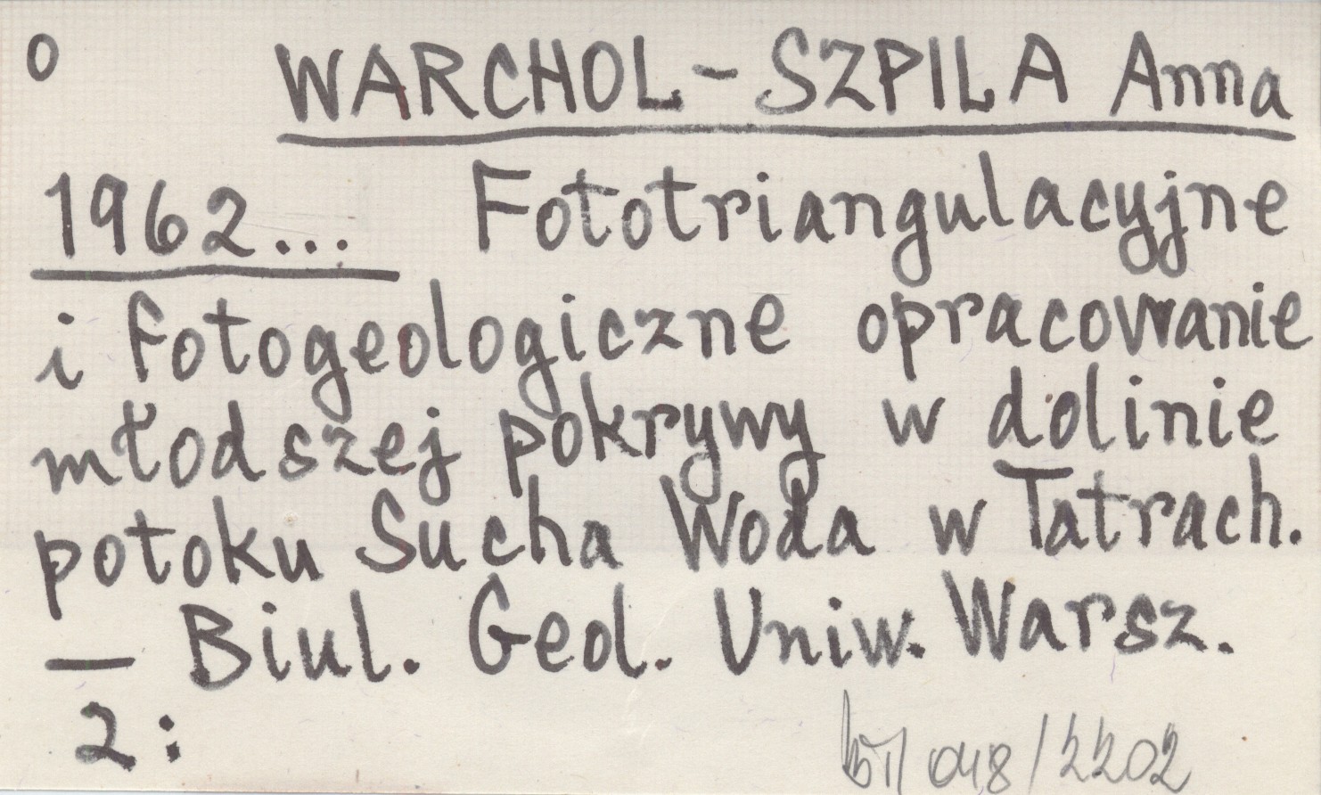WARCHOL-SZPILA Anna 1962... Fototriangulacyjne i fotogeologiczne opracowanie młodszej pokrywy w dolinie potoku Sucha Woda w Tatrach.