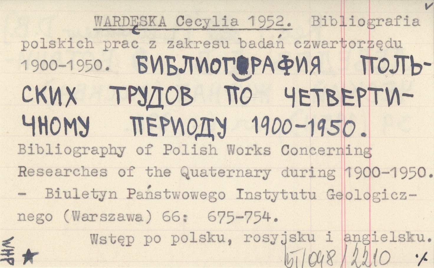 WARDĘSKA Cecylia 1952 Bibliografia polskich prac z zakresu badań czwartorzędu 1900-1950. Bibliografija pol'skich trudov po četvertičnomu periodu 1900-1950. Bibliography of Polish Works Concerning Researches of the Quaternary during 1900-1950.