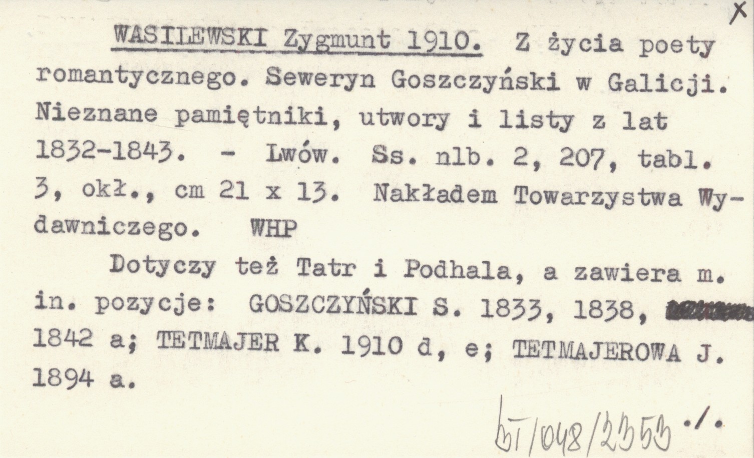 WASILEWSKI Zygmunt 1910 Z życia poety romantycznego. Seweryn Goszczyński w Galicji. Nieznane pamiętniki, utwory i listy z lat 1832-1843.