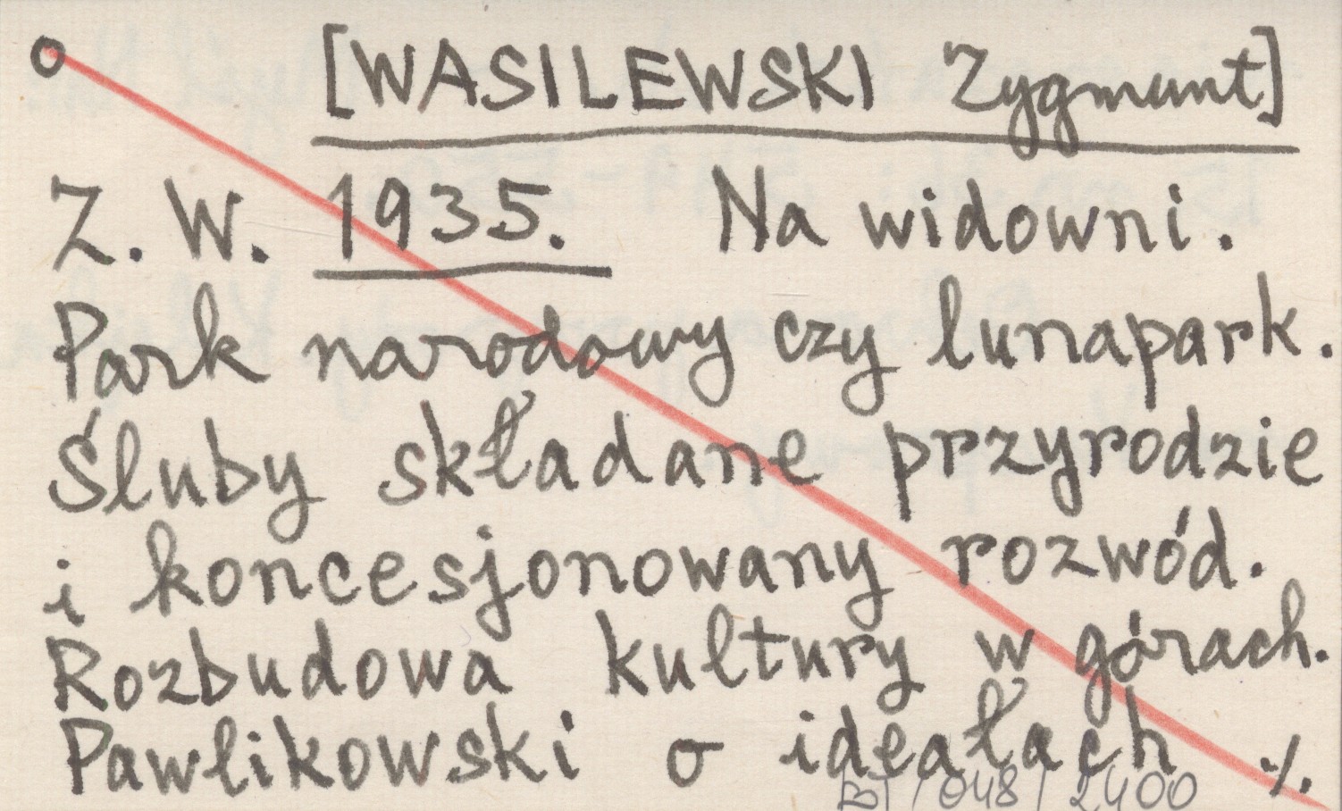 Z. W. [WASILEWSKI Zygmunt] 1935 Na widowni. Park narodowy czy lunapark. Śluby składane przyrodzie i koncesjonowany rozwód. Rozbudowa kultury w górach. Pawlikowski o ideałach mieszczańskich.