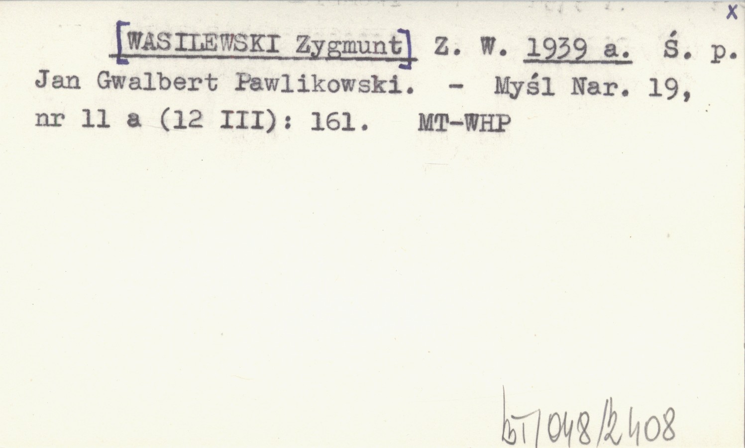 Z. W. [WASILEWSKI Zygmunt] 1939 a Ś. p. Jan Gwalbert Pawlikowski.