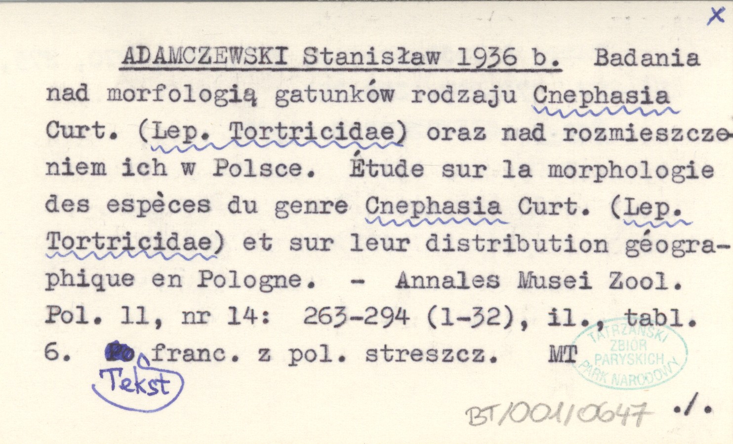 ADAMCZEWSKI Stanisław 1936 b Badania nad morfologią gatunków rodzaju Cnephasia Curt. (Lep. Tortricidae) oraz nad rozmieszczeniem ich w Polsce. Étude sur la morphologie des espéces du genre Cnephasia Curt. (Lep. Tortricidae) et sur leur distribution géographique en Pologne.
