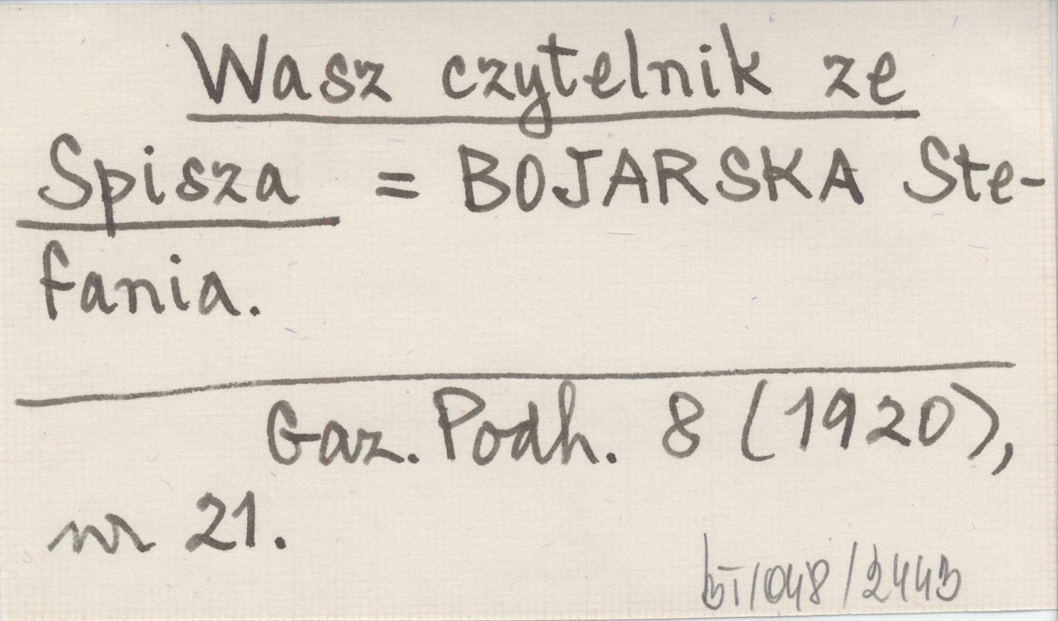 Wasz czytelnik ze Spisza BOJARSKA Stefania Gazeta Podhalańska 8 (1920), nr 21.