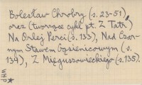 Warszawa ; Kraków ; , 165 s., 1 k. tabl., okł. Tatr dotyczą wiersze: Bolesław Chrobry (s. 23-51) oraz (tworzące cykl pt. Z Tatr) Na Orlej Perci (s. 133), Nad Czarnym Stawem Gąsienicowym (s. 134), Z Mięguszowieckiego (s. 135). Portret autora rysował Leon Wyczółkowski.