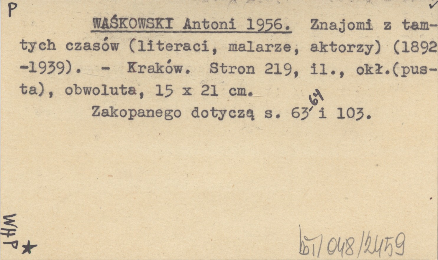 WAŚKOWSKI Antoni 1956 Znajomi z tamtych czasów (literaci, malarze, aktorzy)(1892-1939).