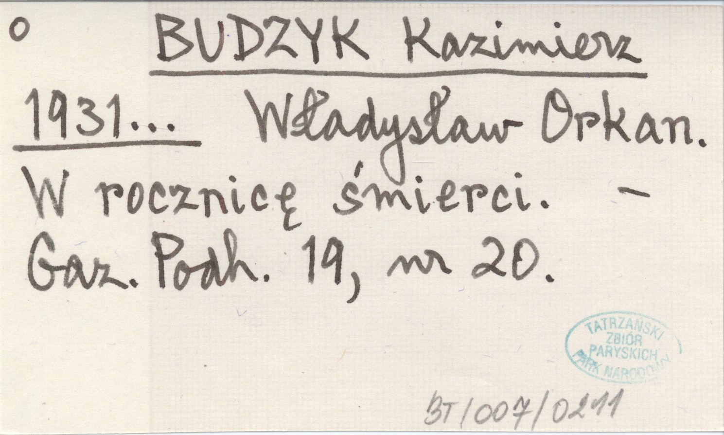BUDZYK Kazimierz 1931... Władysław Orkan. W rocznicę śmierci.