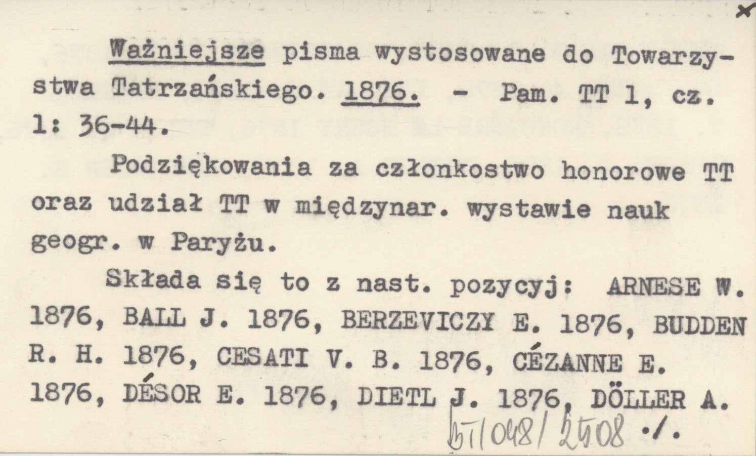 Pamiętnik Towarzystwa Tatrzańskiego, 1, cz. 1: 36-44. Podziękowania za członkostwo honorowe TT oraz udział TT w międzynar. wystawie nauk geogr. w Paryżu. Składa się to z nast. pozycyj: ARNESE W. 1876, BALL J. 1876, BERZEVICZY E. 1876, BUDDEN R. H. 1876, CESATI V. B. 1876, CÉZANNE E. 1876, DÉSOR E. 1876, DIETL J. 1876, DÖLLER A. 1876, GAL J. B. 1876, KRASZEWSKI J. I. 1876, LEMERCIER A. 1876, LONGMAN W. 1876, PETERSEN T. 1876, RONCIÉRE-LE NOURY 1876, SELLA Q. 1876, SPANNA O. 1876, WITTIK A. 1876, ZÄHRINGER H. 1876.