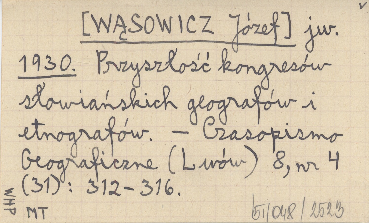 jw. [WĄSOWICZ Józef] 1930 Przyszłość kongresów słowiańskich geografów i etnografów.