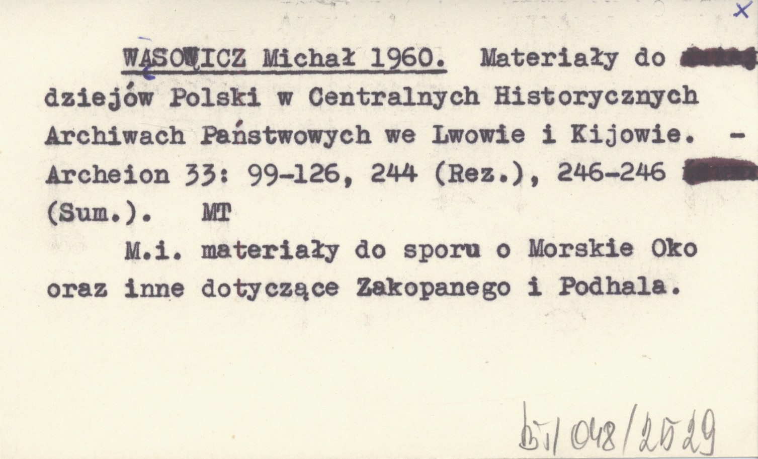 Archeion, 33: 99-126, 244 (Rez.), 246-246 (Sum.). M.i. materiały do sporu o Morskie Oko oraz inne dotyczące Zakopanego i Podhala.