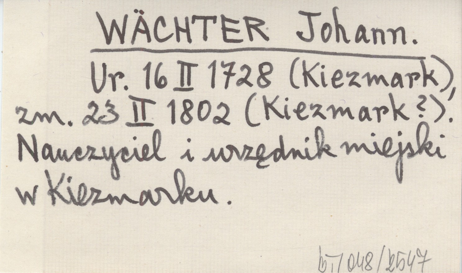 Ur. 16 II 1728 (Kiezmark), zm. 23 II 1802 (Kiezmark?). Nauczyciel i urzędnik miejski w Kiezmarku.