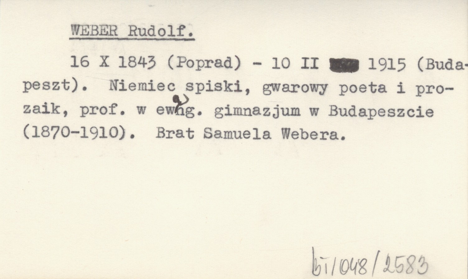 16 X 1843 (Poprad) - 10 II 1915 (Budapeszt). Niemiec spiski, gwarowy poeta i prozaik, prof. w ewang. gimnazjum w Budapeszcie (1870-1910). Brat Samuela Webera.