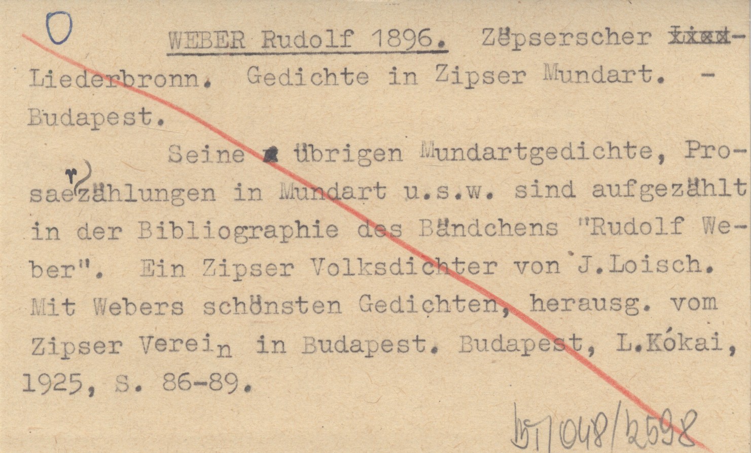Budapest , Seine übrigen Mundartgedichte, Prosaerzählungen in Mundart u.s.w. sind aufgezählt in der Bibliographie des Bändchens "Rudolf Weber". Ein Zipser Volksdichter von J.Loisch. Mit Webers schönsten Gedichten, herausg. vom Zipser Verein in Budapest. Budapest, L.Kókai, 1925, S. 86-89.